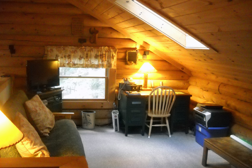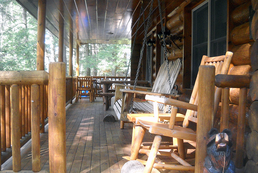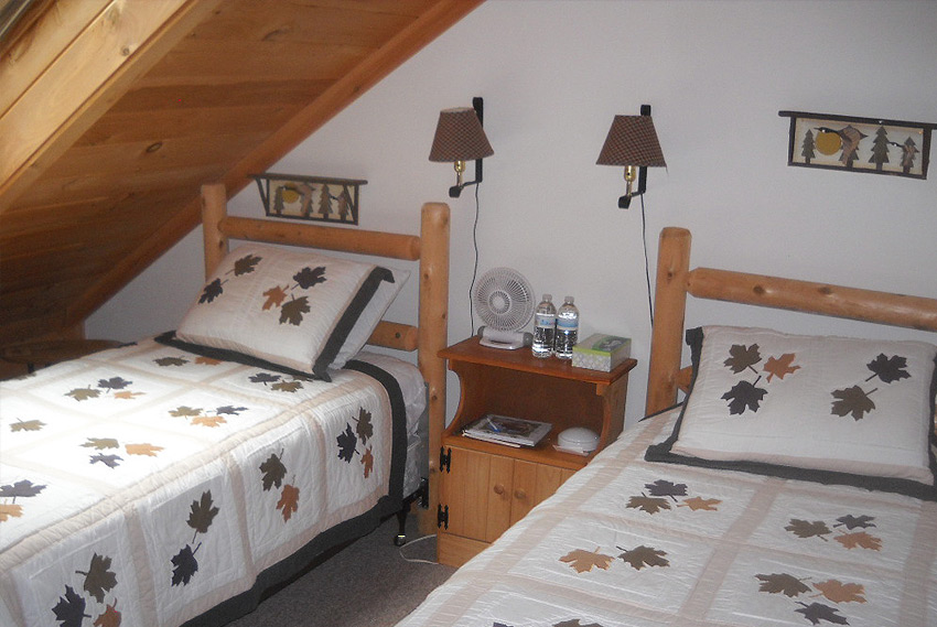 Black Fox sleeps 6 with a queen size bed in the master bedroom, twin beds in the upstairs bedroom and a Futon bed in the sleeping loft, living room with fireplace, one and a half baths, full eat-in kitchen with all modern appliances including dishwasher, microwave, and a local telephone. The Black Fox Cabin has an extended length porch with lighting for evening use, two picnic tables and a swing. The porch overlooks the Roaring Branch stream. We are a smoke-free, pet free cabin.
