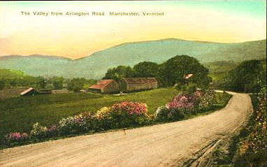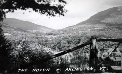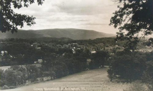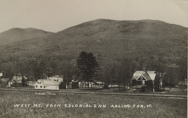 - Row 4: Postcard labeled, "White foam of spring in the Roaring Branch flowing into the Battenkill River at Arlington, Vermont", "Looking west from the Colonial Inn", "Arlington Road"